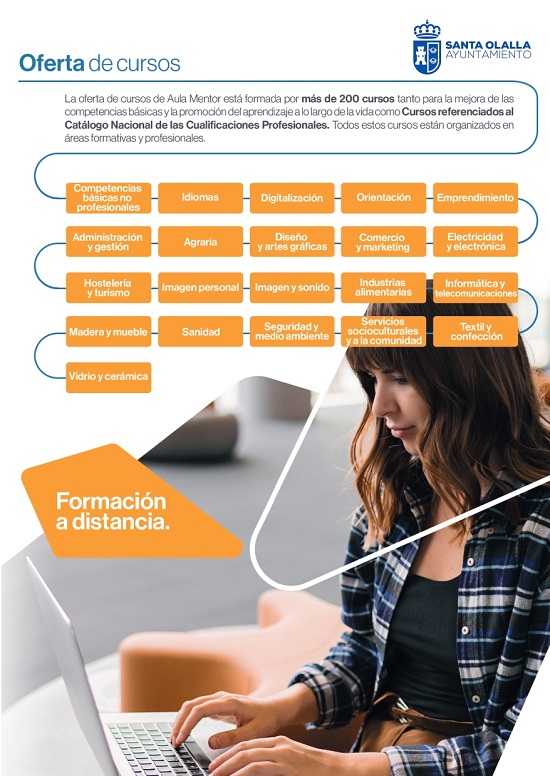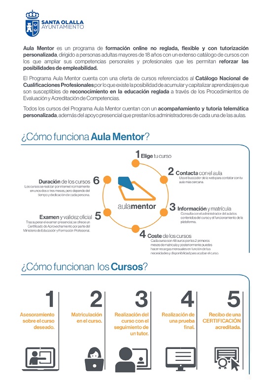 Aula Mentor es un programa de formación online, no reglada, flexible y con tutorización personalizada dirigida a personas mayores de 18 años, un aula con más de 200 cursos con los que ampliar tus competencias personales y profesionales, promovido por el Ministerio de Educación, Cultura y Deporte de España. Con apoyo presencial a través de los administradores del Aula Mentor Santa Olalla, en la Biblioteca Municipal en la Casa de Cultura de Santa Olalla (Calle Mayor, 17).