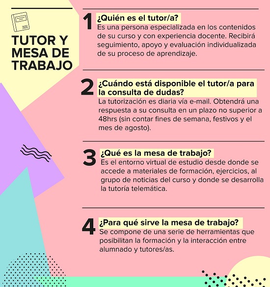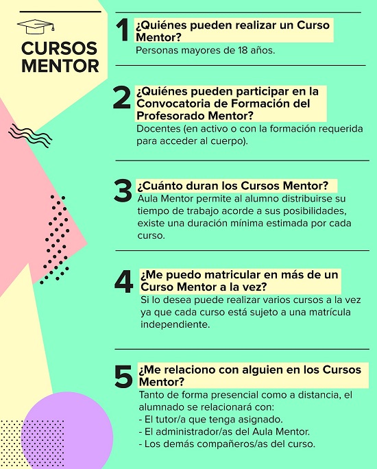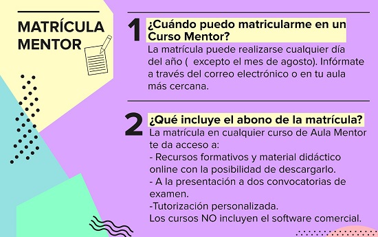 Todos los cursos del Programa Aula Mentor cuentan con un acompañamiento y tutoría telemática personalizada, además del apoyo presencial que prestan los administradores de cada una de las aulas. Podrás presentarte a las convocatorias de examen presenciales para valorar el grado de aprovechamiento del curso y obtener un certificado de aprovechamiento emitido por el Ministerio de Educación.